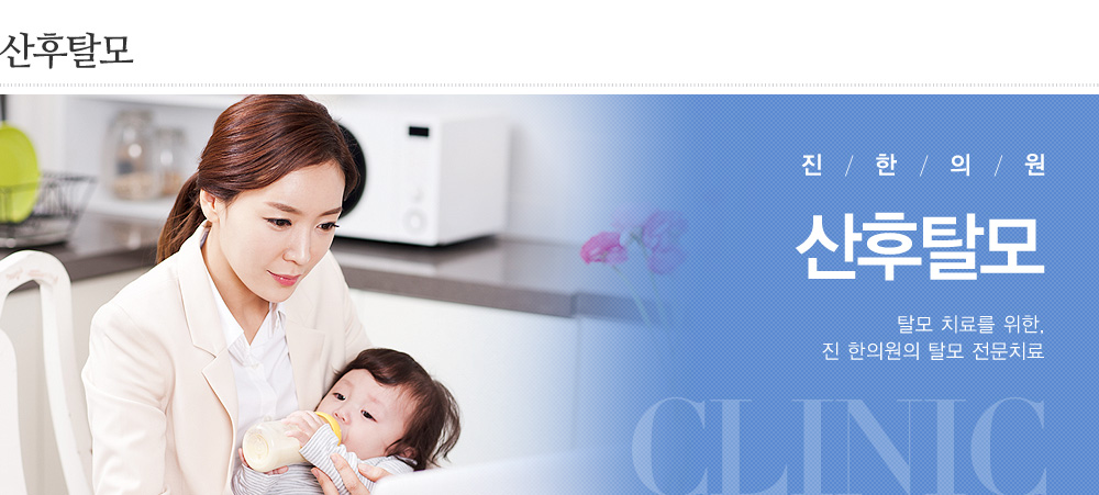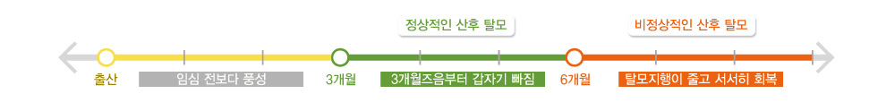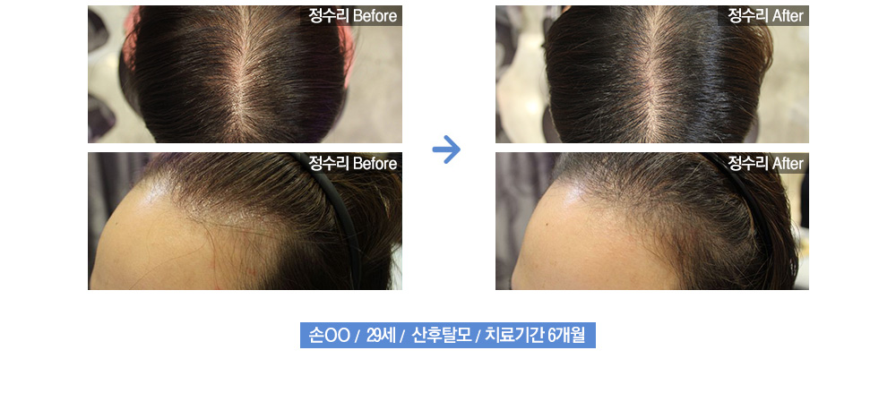 모발을 자라게 하는 대표적 여성호르몬인 ‘에스트로겐’은 임신과 함께 약 10배 가까이 증가합니다. 때문에 임신 기간 동안 여성의 모발은 지속적인 성장상태에 놓이게 되면서 평소보다 훨씬 풍성한 머릿결을 유지하게 됩니다. 그러나 출산과 동시에 증가했던 여성 호르몬이 다시 정상수준으로 돌아가게 되면서 성장기에 머무르던 모발들이 일시에 빠지게 되는 일시적인 탈모증세를 경험하게 되는데, 보통 출산 후 3~6개월 이내에 발생하며 호르몬의 균형이 정화되면서 서서히 탈모진행이 줄어들어 회복되는 것이 일반적입니다. 이는 정상적이고 누구나 겪을 수 있는 자연스러운 현상이므로 특별히 치료를 권하지 않습니다.그러나 문제는 산후 6개월이 지나도록 탈모가 계속해서 진행되는 경우입니다. 출산 후 6개월이 지나도 신생모발이 자라지 않고 지속적으로 탈모가 진행되는 경우에는 비정상적인 탈모형태로 간주되며, 모발 전체에 빠르게 확산될 우려가 있으므로 빠른 치료가 필요합니다.