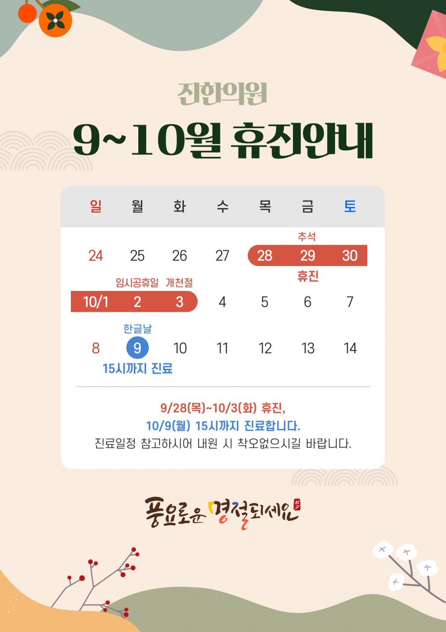 9월 28일 (목요일) ~ 10월 2일 (월요일) 추석연휴 휴무입니다.10월 3일 (화요일) 개천절 휴무입니다.10월 9일 (월요일) 한글날은 오후 3시까지 단축진료 입니다.