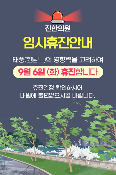 태풍(힌남노)의 영향력을 고려하여 9월 6일 휴진합니다.