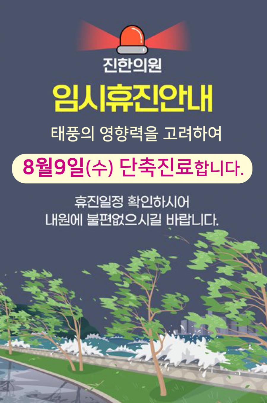 8월 9일(수요일) 태풍으로 인해 오후 5시까지 진료합니다.