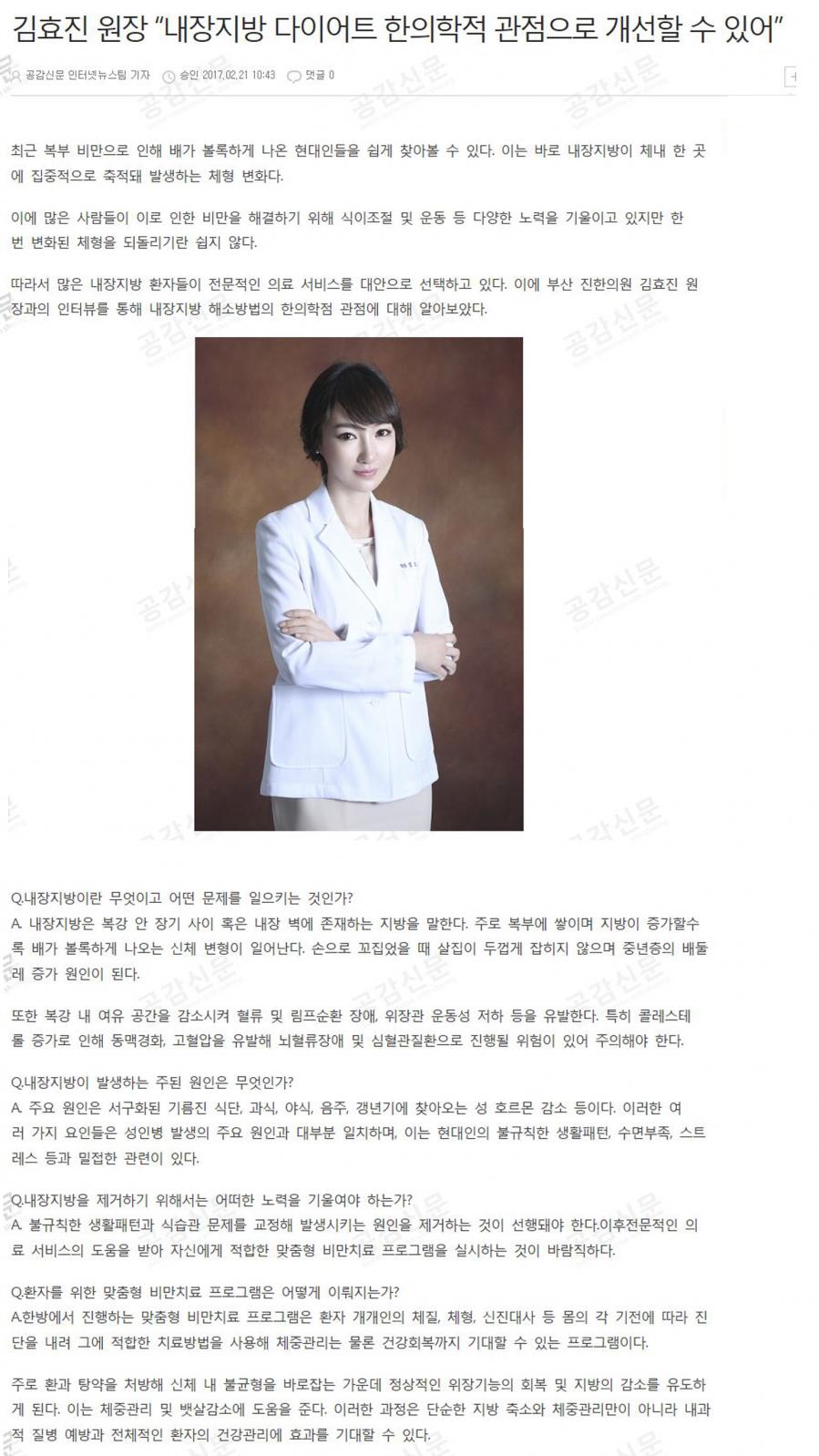 24 | [공감신문] 김효진 원장 `내장지방 다이어트 한의학.. | | 2017.02.22 | 23,077 |