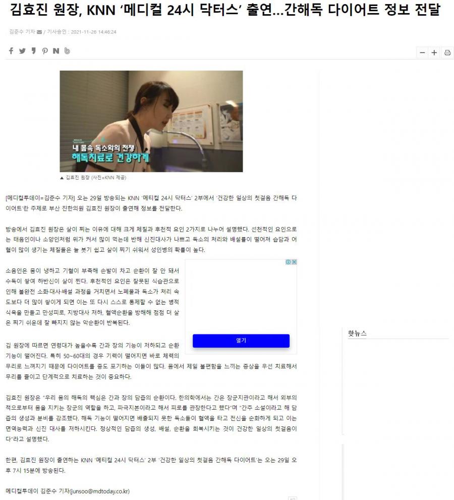 48 | 김효진 원장, KNN `메디컬24시 닥터스` 건강한 일상의 .. | | 2021.11.29 | 23,890 |
