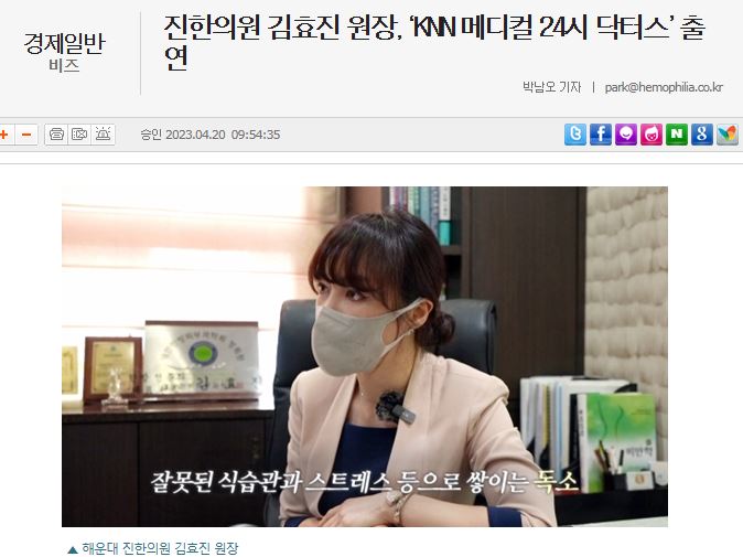 해운대 진한의원 김효진 원장이 4월 24일(월) KNN 메티컬 24시 닥터스 1부에 출연, ‘만병의 근원 내장지방을 잡아라!’란 주제로 건강 정보를 전달한다고 전했다.