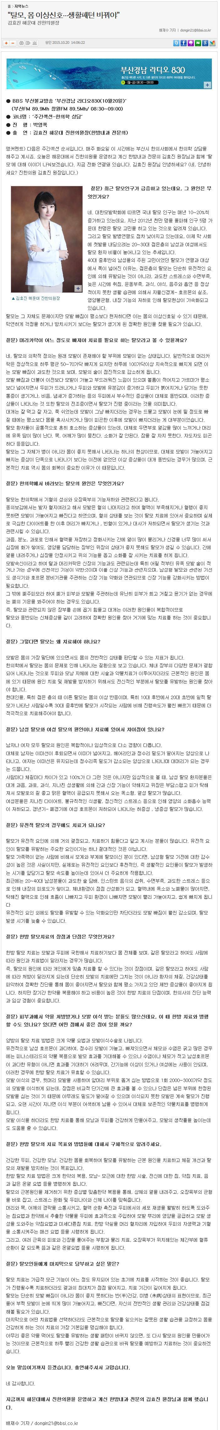 9 | [BBS 뉴스] "탈모, 몸 이상신호.....생활패턴 바꿔야" | | 2015.10.20 | 59,176 |